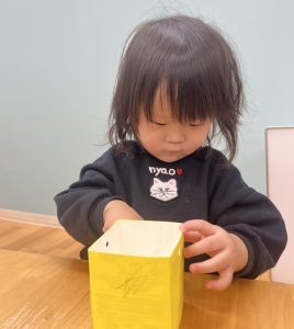 豆入れはまず、黄色い画用紙が貼られた紙パックに